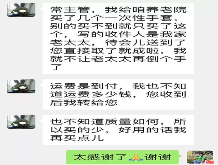 在此期間泰和養老院的工作得到家屬和老人們的認可,有的家屬還為養老院送上了防御物資,感謝老人和家屬對泰和養老院的信任與支持,我們將以竭己之力為老人服務,不負所托,后顧無憂!